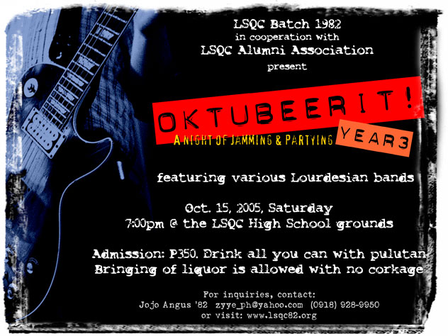 �r batch s hosting OktuBEERit, proudly 3rd yr na. A nyt of fun w/ live bands 2 ntertain us. Drink ol u can + pulutan @350. PUNTA KA sa LSQC HS Oct 15 Sabado 7pm!�